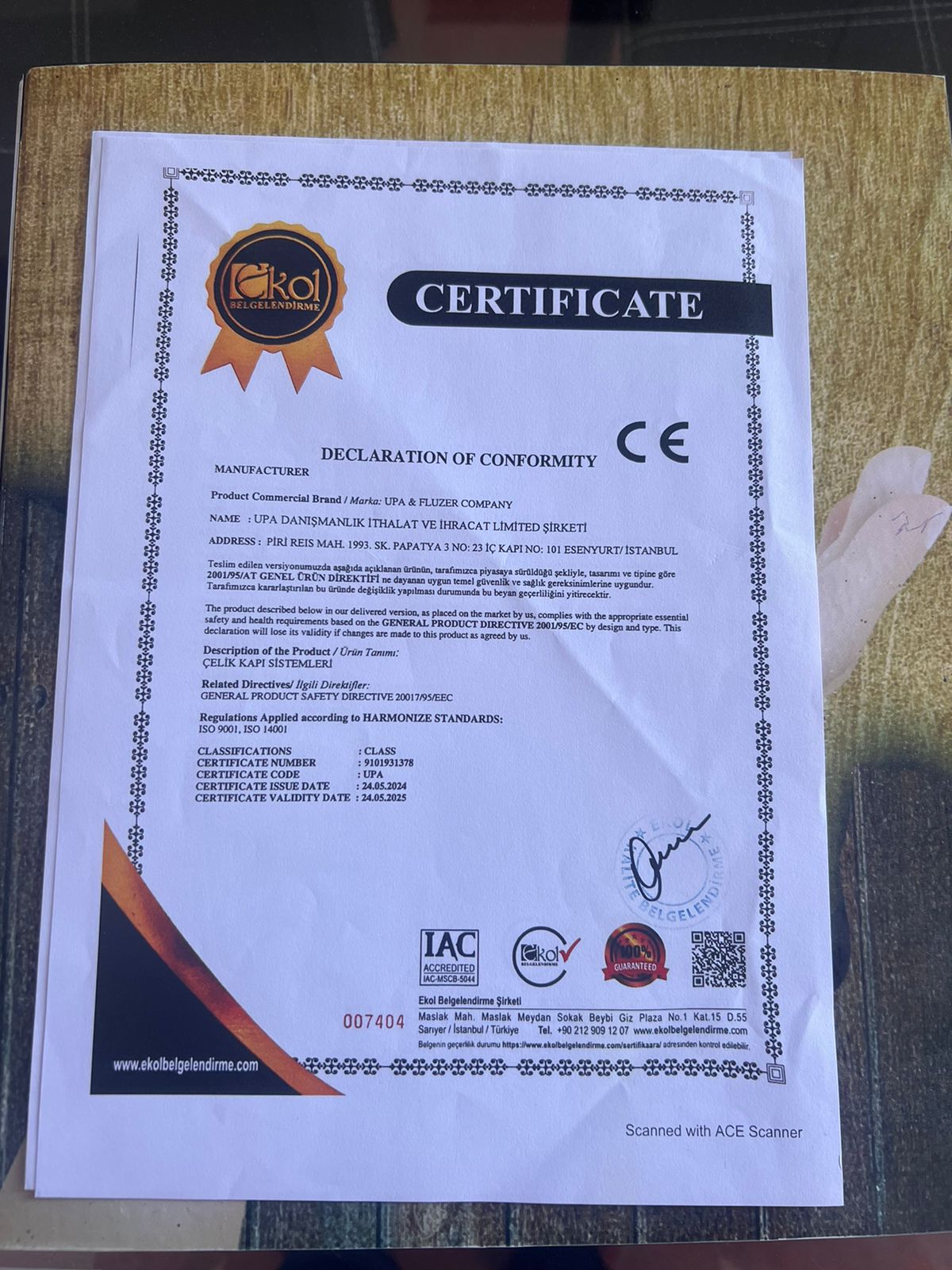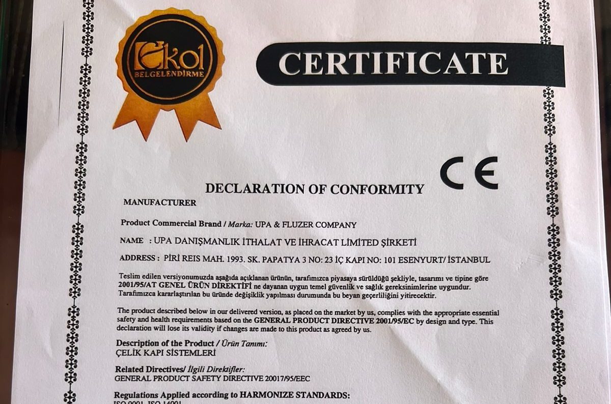 Të gjitha dyert e prodhuara nga Upa & Fluzer janë të certifikuara me CE, duke garantuar përputhjen e tyre me direktivat e sigurisë dhe cilësisë së Bashkimit Evropian. Kjo është një dëshmi e përkushtimit tonë për të ofruar vetëm produktet më të mira në treg.